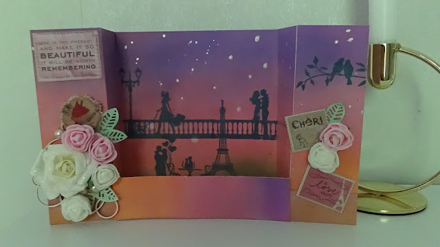 Här har jag klistrat fast love-kollaget med stick and spray (limspray), för att hålla schablonen på plats medan jag penslade in tre olika nyanser av blå distress oxide ink med en blending brush från Tim Holtz. Jag provade att pensla in färg med en puderborste, men det gick inte så bra. Den var alldeles för mjuk.