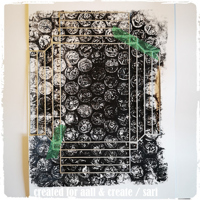 Jag använder mig av tim Holtz stampingtool eftersom stämpeln är så stor. Jag gjorde misstaget att inte ta barnpuder på stämpeln som är av sorten clearstämpel. Denna sorten är väldigt klistrig i början och fastnar lätt i pappret. Tar man lite barnpuder på stämpeln innan och borstar bort överflödet så klistrar den inte så. Nu lyckades jag få ett dubbelmönster på båda mina sidor, men jag tyckte inte det gjorde så mycket. Det kommer inte synas så tydligt efter färg och stencilinfärgningar osv. Jag stämplar med archival inc eftersom det är en vattenfast dyna. Jag stämplar även en kant runt pappren med en gammal stämpel från studio light, men det finns en liknande hos Sari, nämligen denna.
